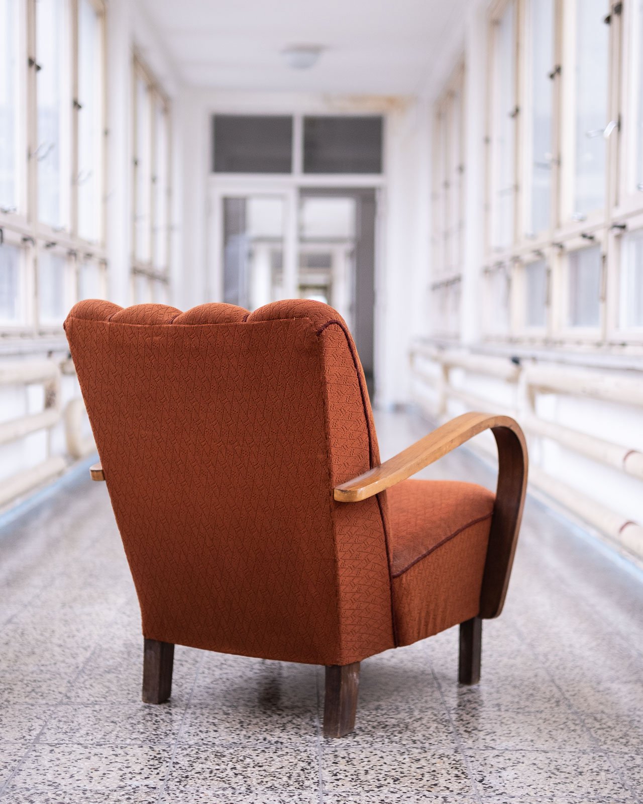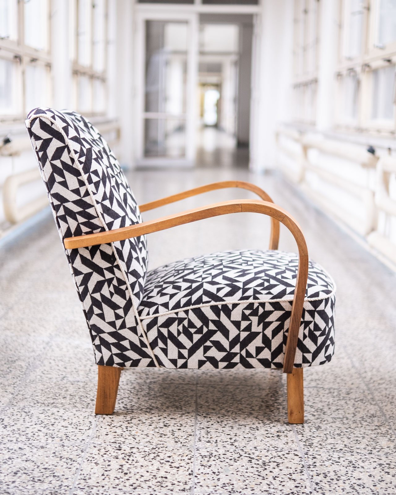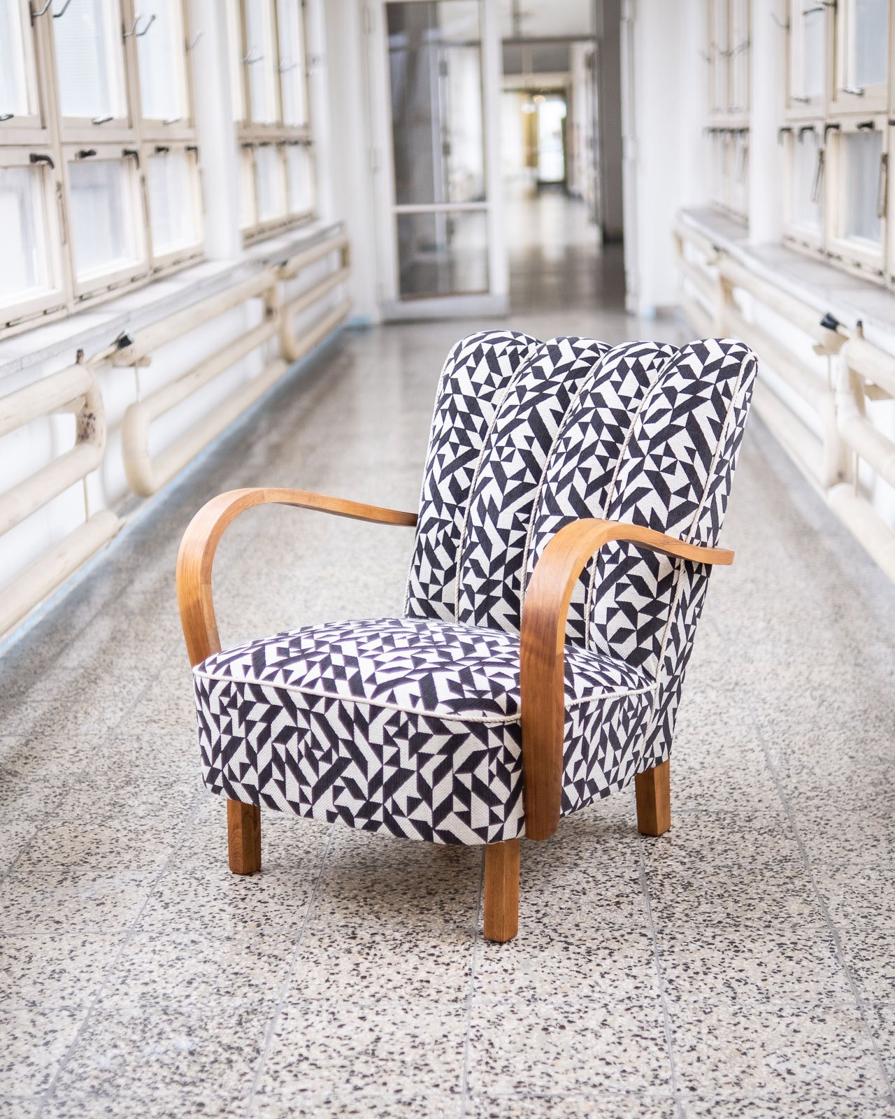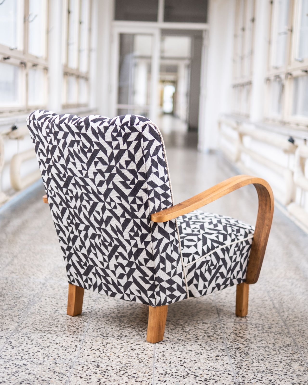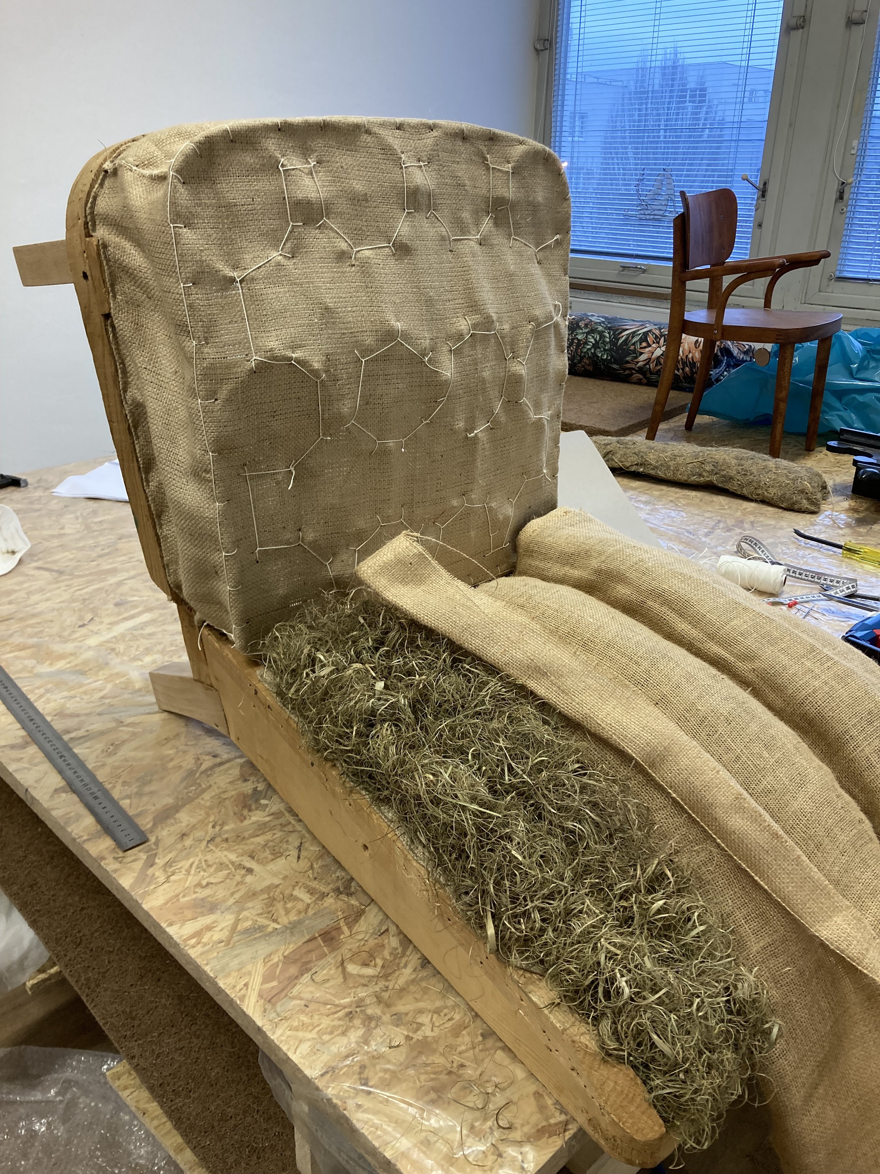 Pružinové křeslo Kompletní čalounění a renovace dřevěných prvků O projektu Čalounění bylo kompletně vyměněno: nové popruhování, nové pružiny a jejich vazba, výměna tvarovacích vrstev a potahové látky s ozdobnou šňůrou. Dýhy u područek byly doplněny, starý lak odstraněn a dřevo ošetřeno směsí přírodních olejů Odie's Oil.