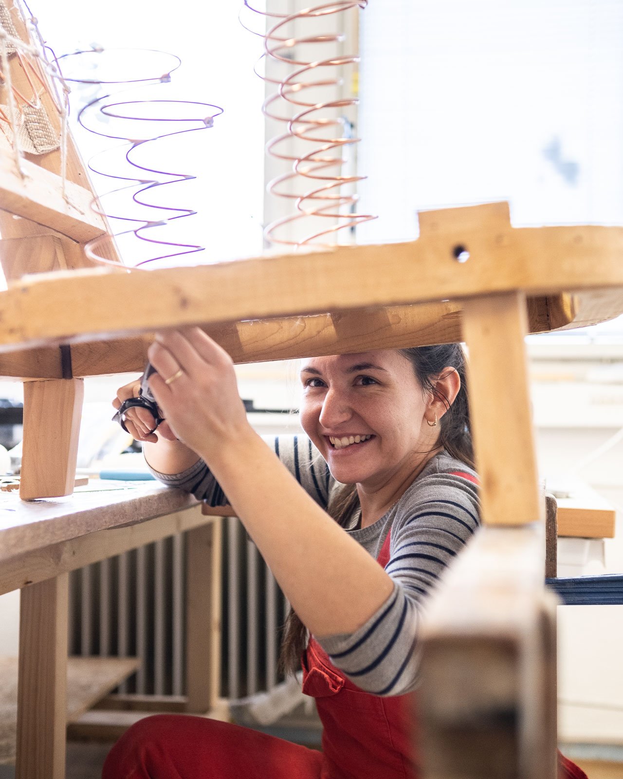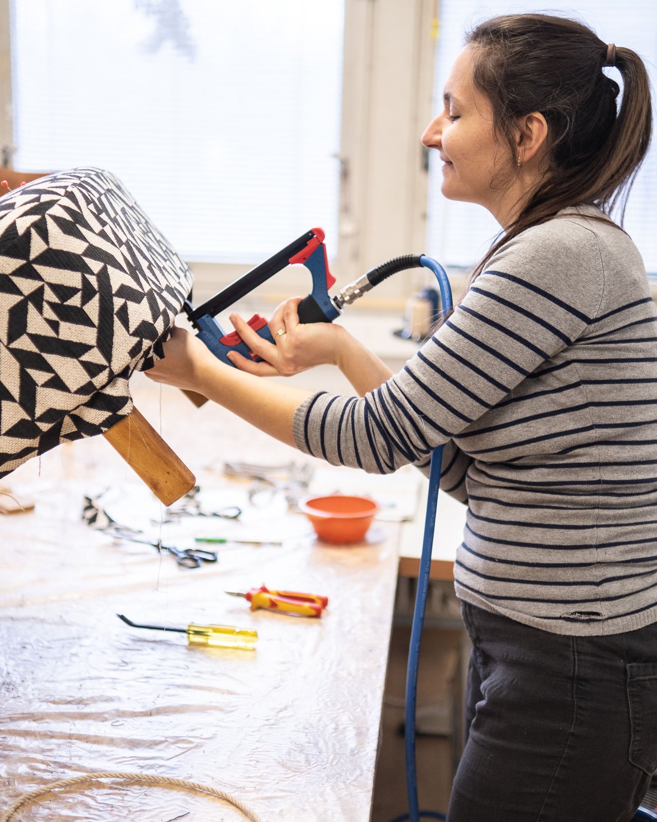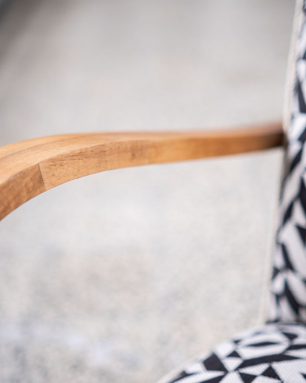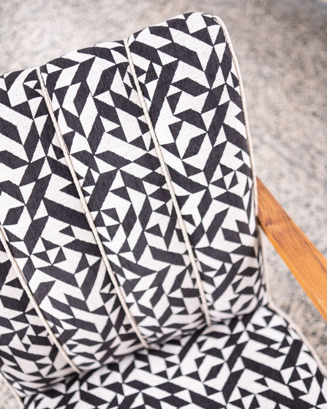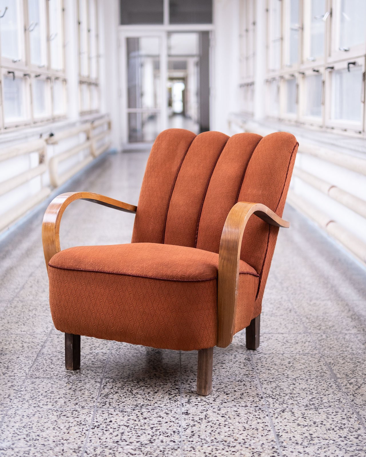 Pružinové křeslo Kompletní čalounění a renovace dřevěných prvků O projektu Čalounění bylo kompletně vyměněno: nové popruhování, nové pružiny a jejich vazba, výměna tvarovacích vrstev a potahové látky s ozdobnou šňůrou. Dýhy u područek byly doplněny, starý lak odstraněn a dřevo ošetřeno směsí přírodních olejů Odie's Oil.